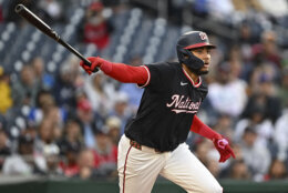 Braves Nationals Baseball Washington Nationals' James Wood follows through on his swing after hitting a three-run double, which scored Alex Call, Jose Tena and CJ Abrams, against Atlanta Braves pitcher AJ Smith-Shawver during the second inning of a baseball game in Washington, Thursday, May 22, 2025. (AP Photo/Terrance Williams)