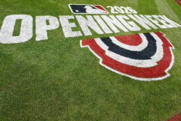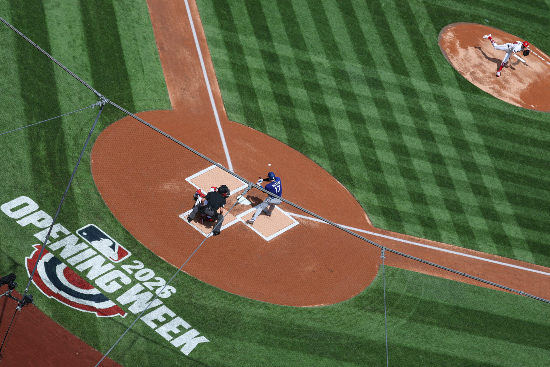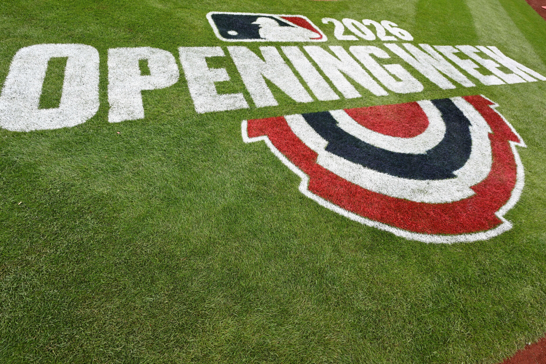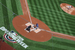 Dodgers Nationals Baseball An opening week logo is displayed on the playing field behind home plate before the Washington Nationals home-opener baseball game against the Los Angeles Dodgers, Friday, April 3, 2026, in Washington. (AP Photo/Terrance Williams)
