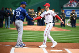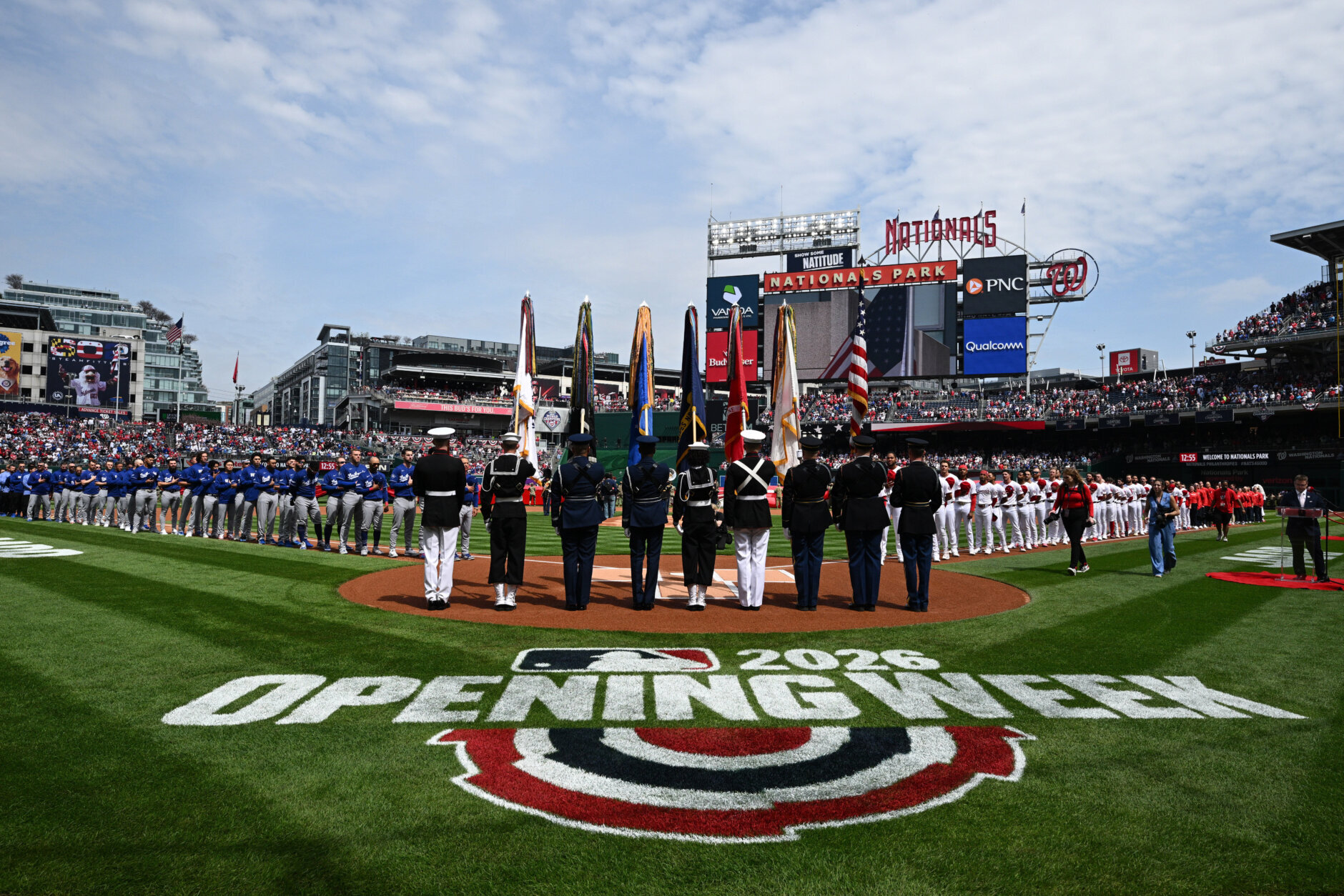 Dodgers Nationals Baseball The Washington Nationals, right, and Los Angeles Dodgers line the baselines during the national anthem before the Nationals home-opening baseball game, Friday, April 3, 2026, in Washington. (AP Photo/Nick Wass)