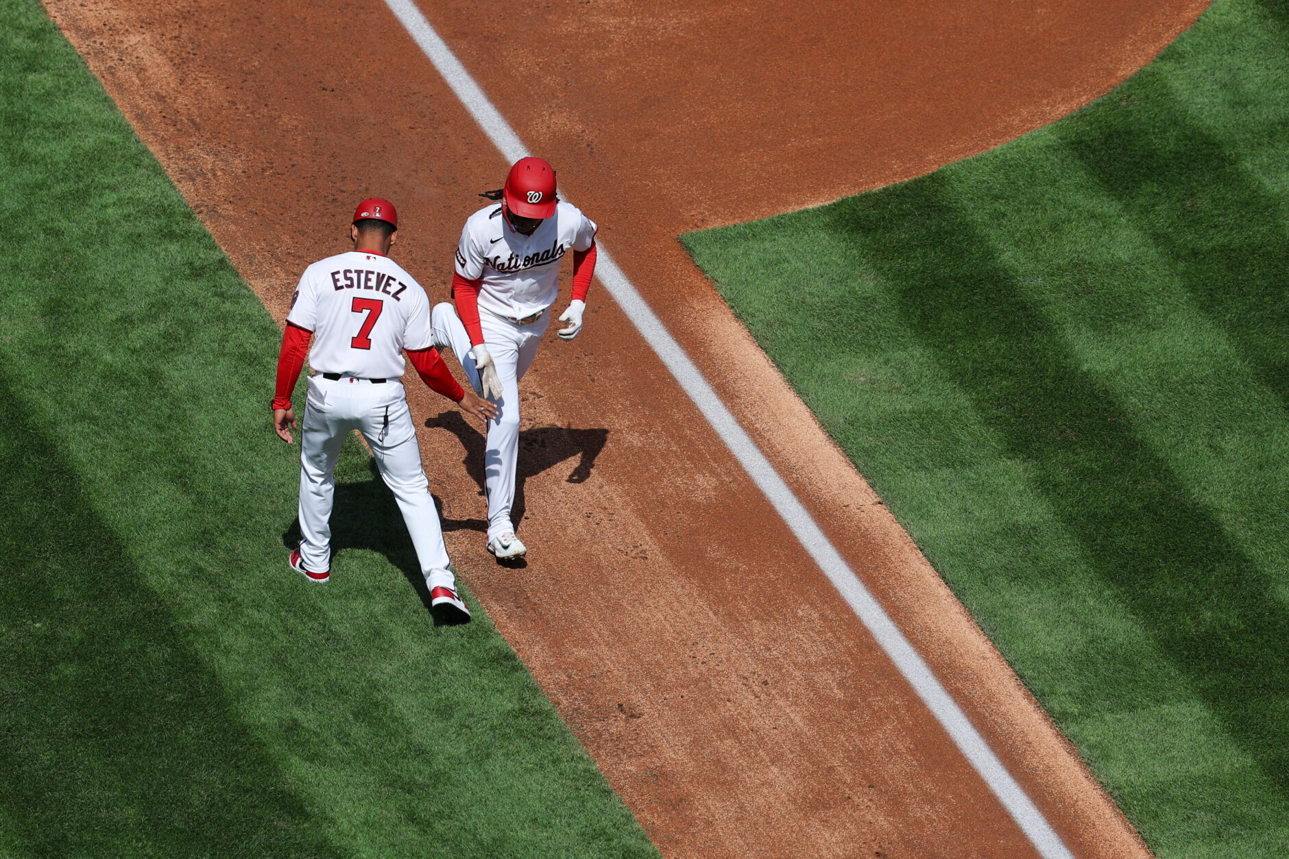 Dodgers Nationals Baseball Washington Nationals' CJ Abrams, right, is greeted by third base coach Victor Estevez (7)r as he runs the bases after hitting a three-run home run during the first inning of an baseball game against the Los Angeles Dodgers, Friday, April 3, 2026, in Washington. (AP Photo/Terrance Williams)