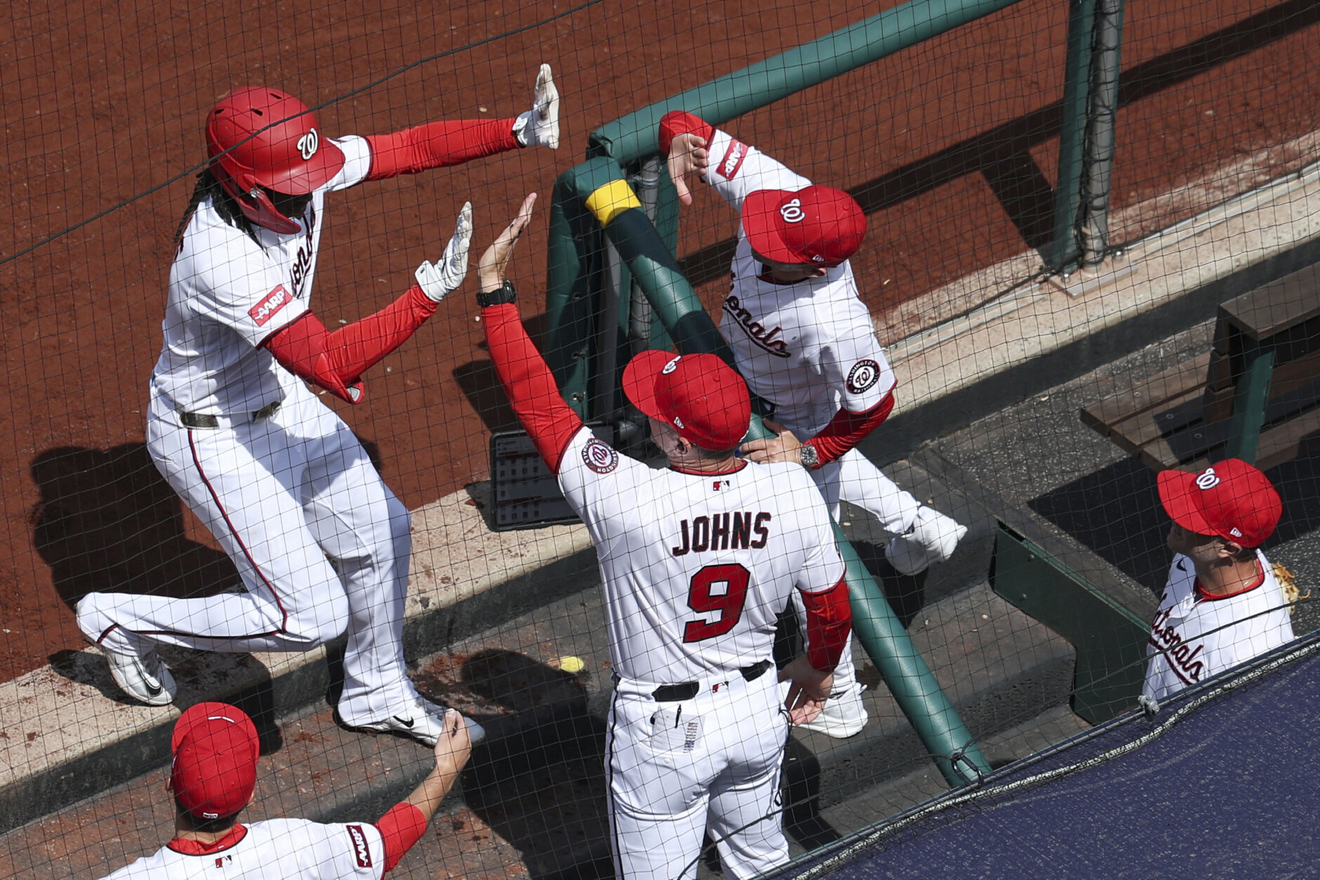 APTOPIX Dodgers Nationals Baseball Washington Nationals' CJ Abrams, left, is greeted by teammates at the dugout after hitting a three run home run against the Los Angeles Dodgers during the first inning of an baseball game, Friday, April 3, 2026, in Washington. (AP Photo/Terrance Williams)