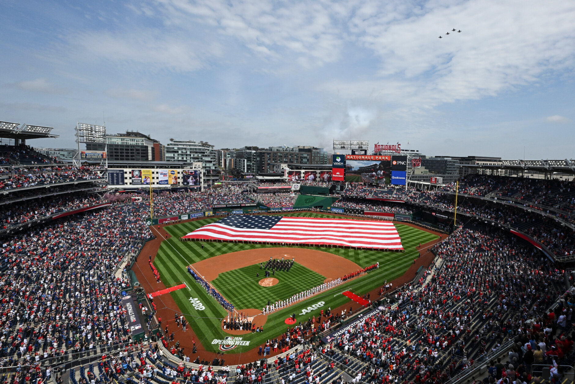 APTOPIX Dodgers Nationals Baseball An American flag is held across the field during the national anthem as F-16C Fighting Falcons flyover before the Washington Nationals home-opener baseball game against the Los Angeles Dodgers, Friday, April 3, 2026, in Washington. (AP Photo/Terrance Williams)