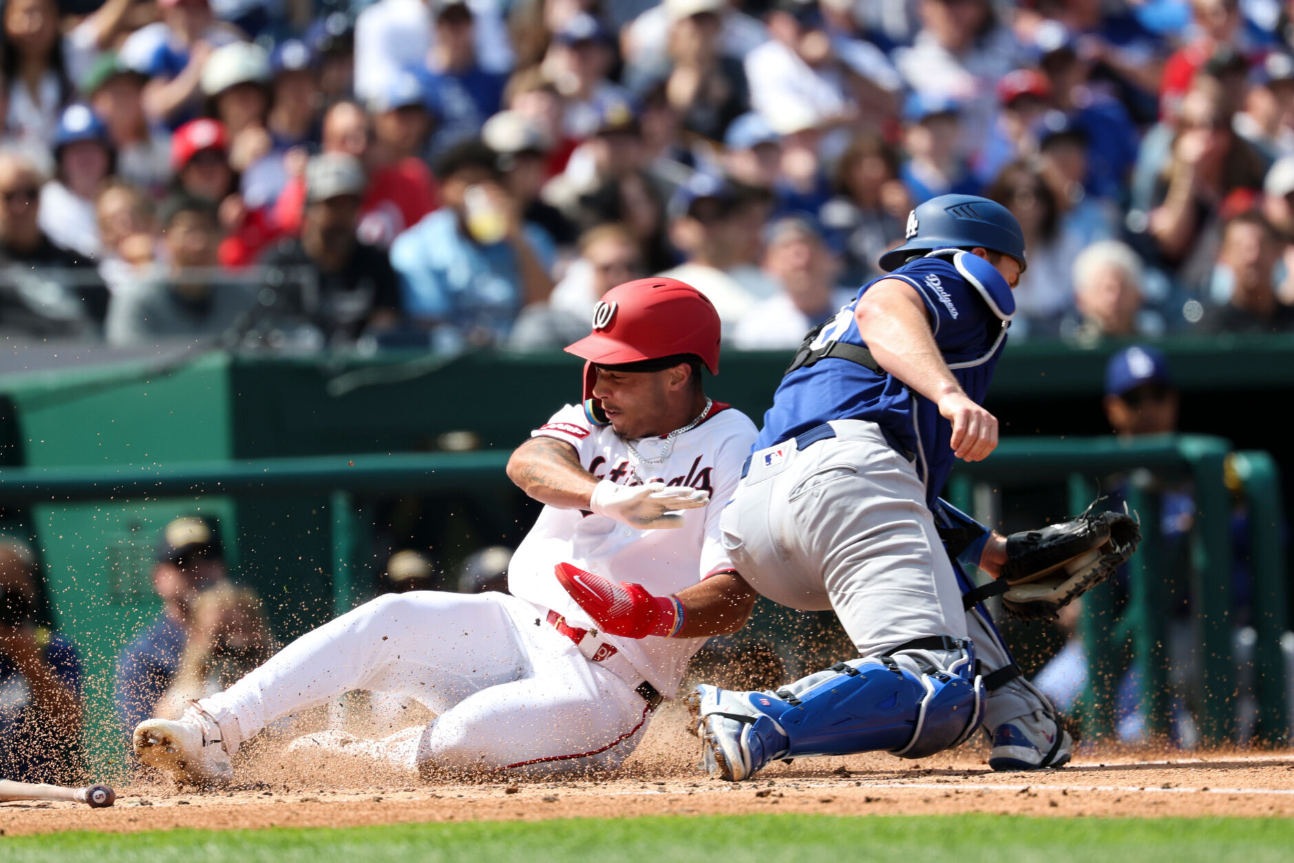 Dodgers Nationals Baseball Washington Nationals' Daylen Lile, left, slides safely into home plate while avoiding a tag by Los Angeles Dodgers catcher Will Smith, right, on a single hit by CJ Abrams off pitcher Emmet Sheehan during the third inning of an baseball game, Friday, April 3, 2026, in Washington. (AP Photo/Terrance Williams)
