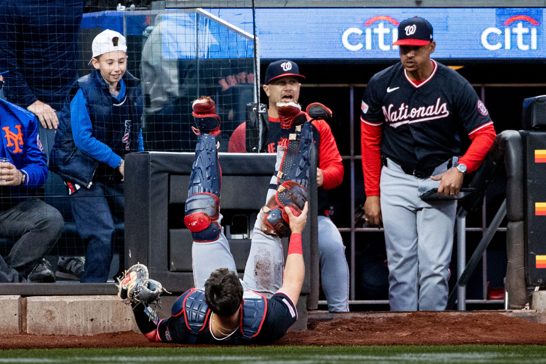 Nationals Mets Baseball Washington Nationals catcher Drew Millas (14) falls while catching a foul ball during the first inning of a baseball game against the New York Mets, Tuesday, April 28, 2026, in New York. (AP Photo/Angelina Katsanis)