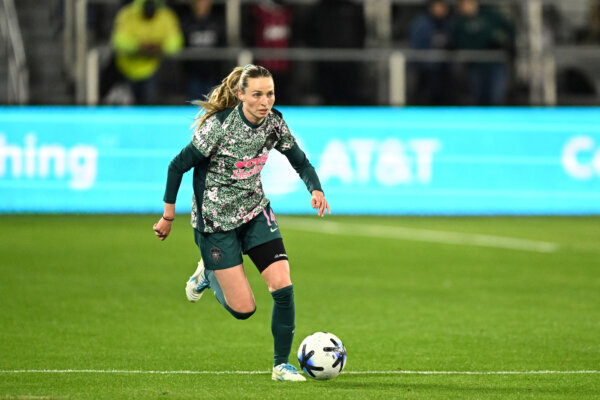 Washington Spirit defender Gabby Carle kicks the ball upfield during the second half of an NWSL soccer match against the Portland Thorns FC on March 13, 2026. (AP Photo/Terrance Williams)