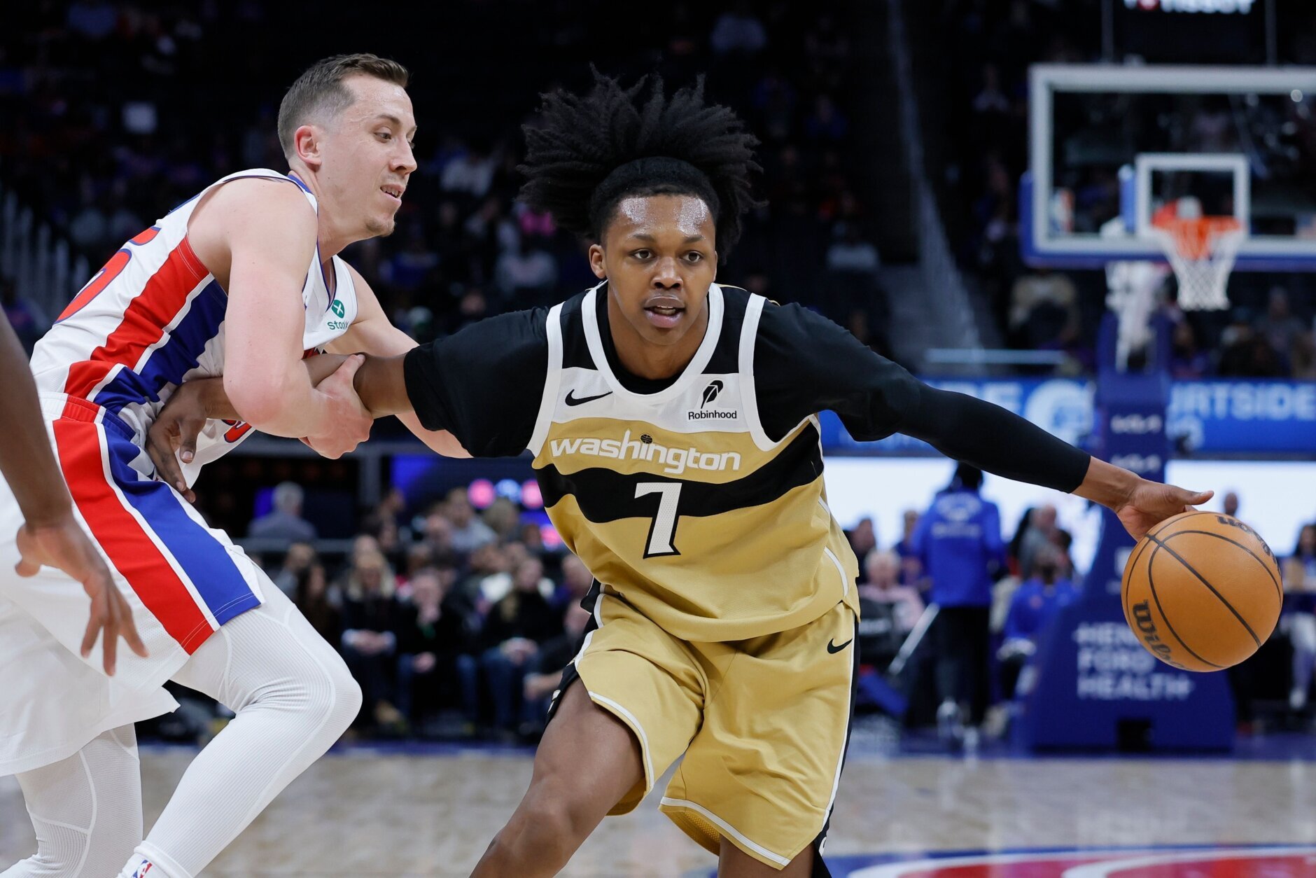 Bub Carrington, Duncan Robinson Washington Wizards guard Bub Carrington (7) is held by Detroit Pistons forward Duncan Robinson, left, while trying to go to the basket during the first half of an NBA basketball game Thursday, Feb. 5, 2026, in Detroit. (AP Photo/Duane Burleson)