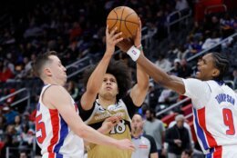 Kyshawn George, Duncan Robinson, Ausar Thompson Washington Wizards forward Kyshawn George (18) is guarded by Detroit Pistons forward Duncan Robinson, left, and guard Ausar Thompson (9) while trying to take a shot during the first half of an NBA basketball game Thursday, Feb. 5, 2026, in Detroit. (AP Photo/Duane Burleson)
