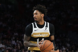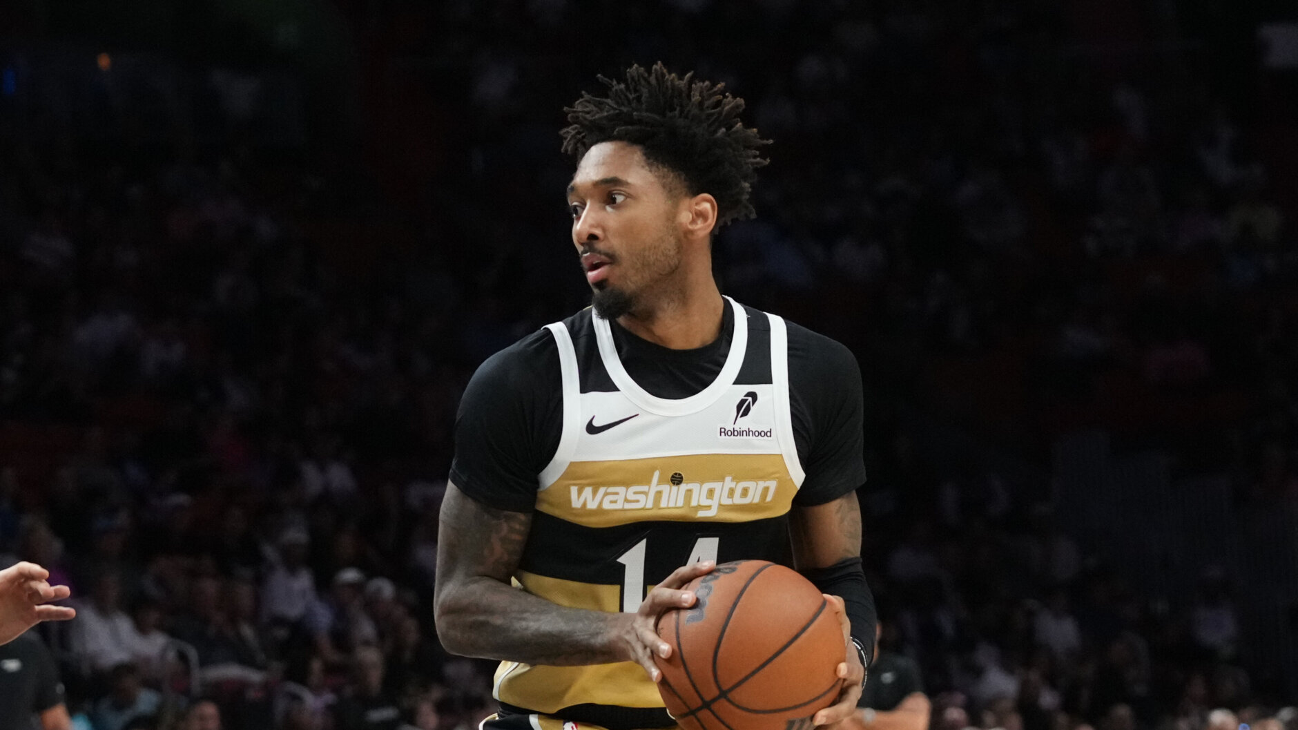 Wizards Basketball Washington Wizards forward Leaky Black (140 grabs a rebound during the first half of an NBA basketball game against the Miami HeatSaturday, April 4, 2026, in Miami. (AP Photo/Marta Lavandier)