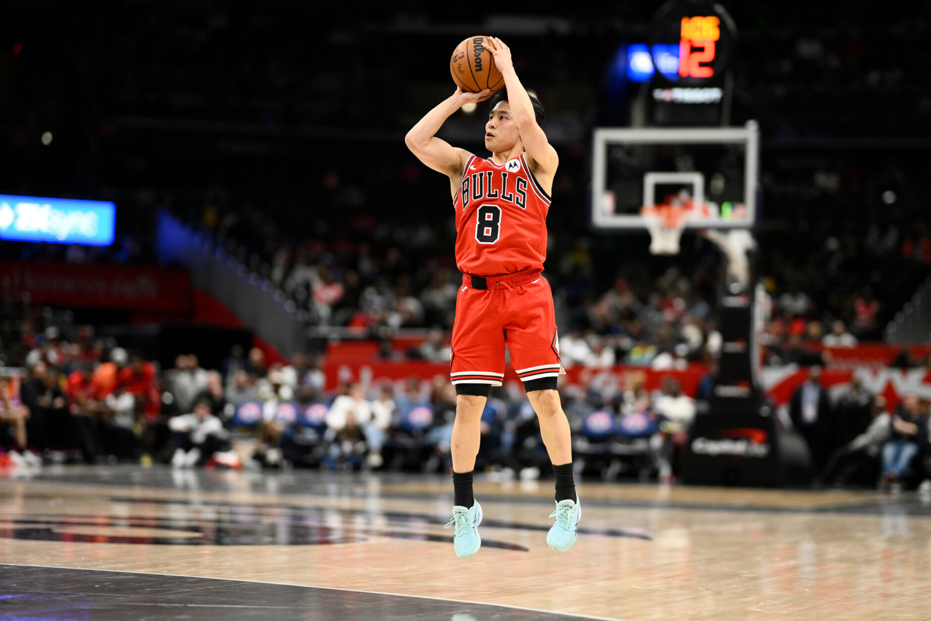 Bulls Wizards Basketball Chicago Bulls guard Yuki Kawamura goes up to shoot during the first half of an NBA basketball game against the Washington Wizards, Thursday, April 9, 2026, in Washington. (AP Photo/Nick Wass)