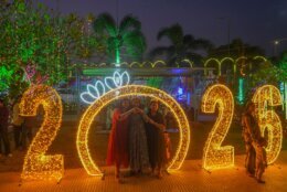 APTOPIX New Year's Eve India People pose for pictures near illuminated decorations on New Year's Eve in Mumbai, India, Wednesday, Dec. 31, 2025. (AP Photo/Rafiq Maqbool)