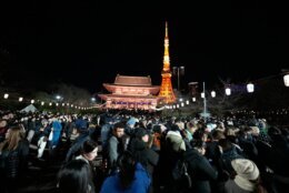 Japan New Year's Eve People gather to celebrate the New Year at the Zojoji Buddhist temple, on Wednesday, Dec. 31, 2025 in Tokyo. (AP Photo/Eugene Hoshiko)