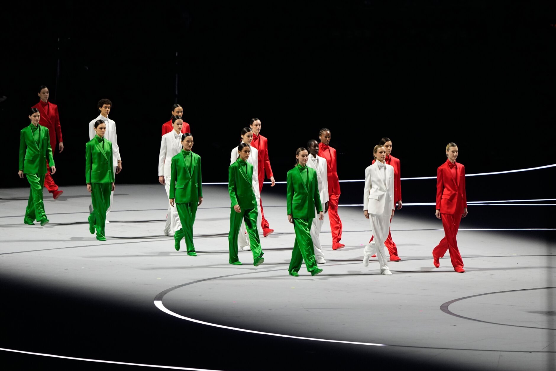 A runway walk showcased outfits — created by the late fashion designer Giorgio Armani, who died last year at 91 — in the colors of Italy’s flag: red, green and white. And balladeer Laura Pausini sang Italy’s national anthem.