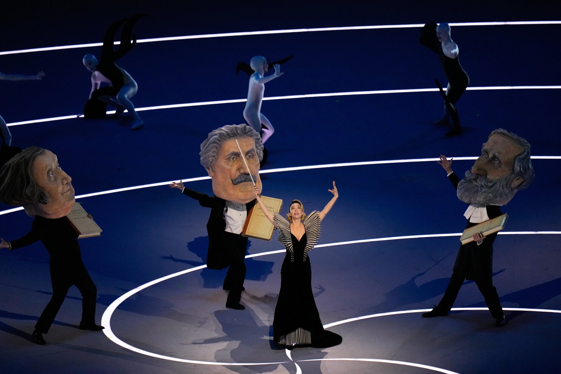 People wearing oversized, mascot-style heads representing opera composers Giacomo Puccini, Gioachino Rossini and Giuseppe Verdi appeared on the central stage, before giant paint tubes floated above and dropped silk of red, blue and yellow — the primary colors — before an early parade of various-color-wearing characters arrived in the stadium. They represented music and art, literature and architecture, appreciations for beauty and history and, above all, “La Dolce Vita” (loosely, Italian for “The Good Life” and the name of a 1960 film by Federico Fellini).